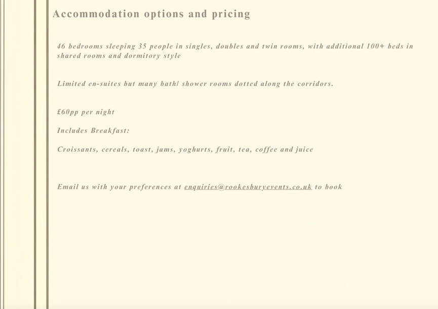 £60pp per night including breakfast in the morning. Email any enquiries either to us at southernnatureartexhibition@gmail.com or to Rookesbury Park at enquiries@rookesburyevents.co.uk